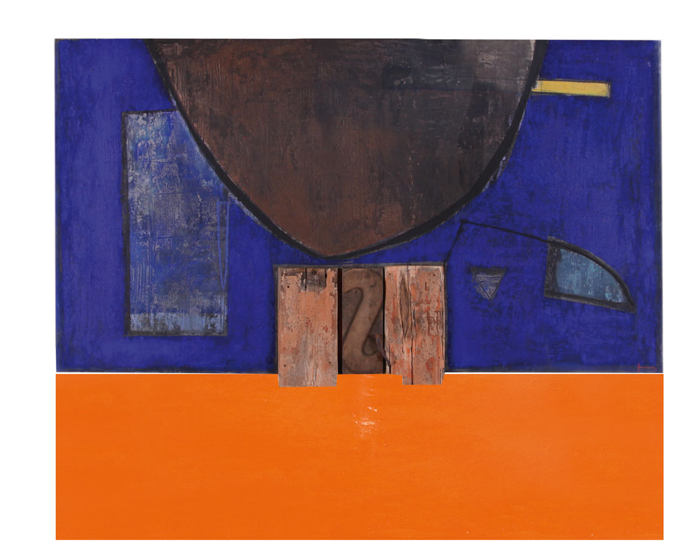 tecnica mista e applicazioni di legni su 2 tavole cm. 89x163 e 44x163, totale cm. 133x163, firma e titolo sul retro della tavola superiore.