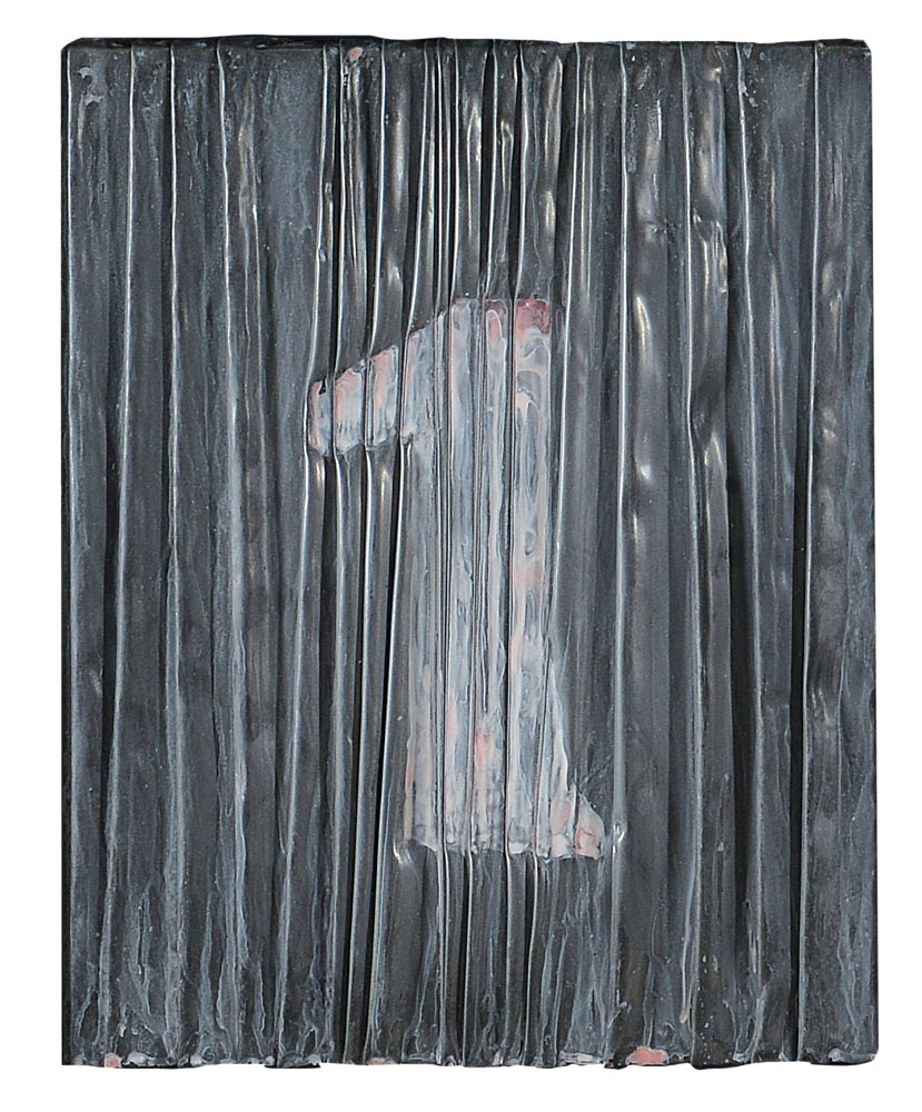 acrilico rosa su lamina di piombo operata applicata su tavola cm. 30,5x24,5; firma e anno al retro, dichiarazione d'autenticità dell'artista su foto.