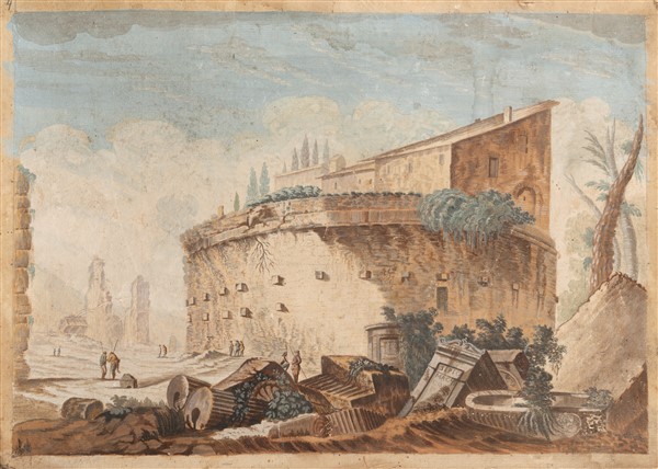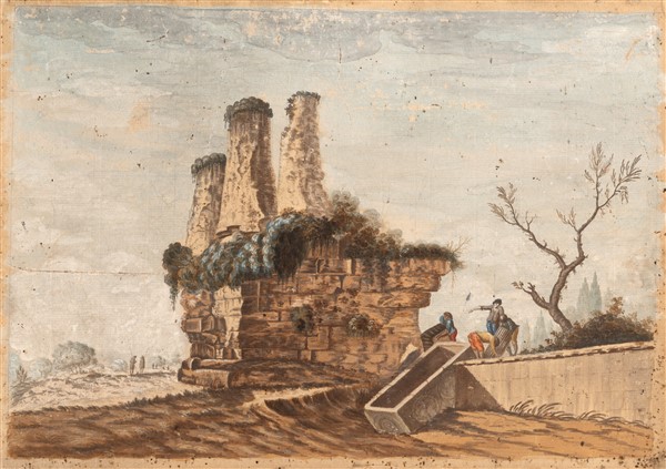 Scuola francese della fine del secolo XVIII "Paesaggi romani con rovine e figu