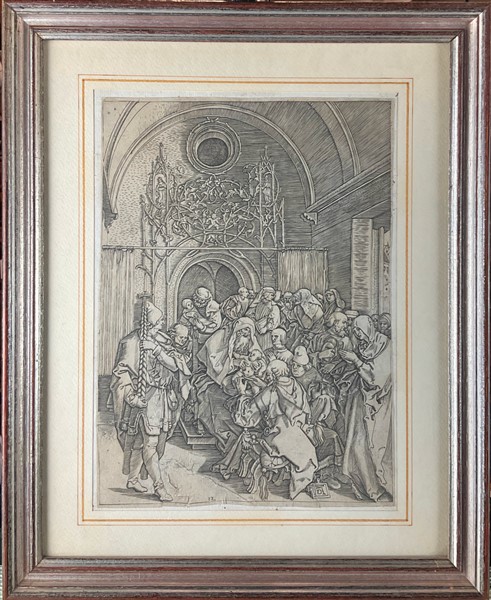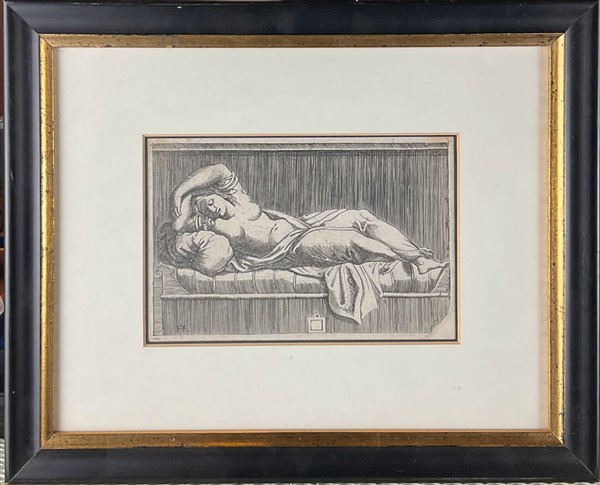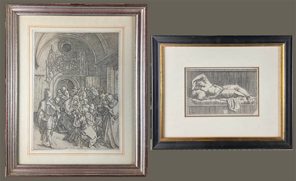 Lotto composto da due antiche incisioni di cui una di Marcantonio Raimondi da Durer raffigurante "Circoincisione" (foglio 294x211) e un bulino raffigurante "Cleopatra" (impronta mm 113x168mm)