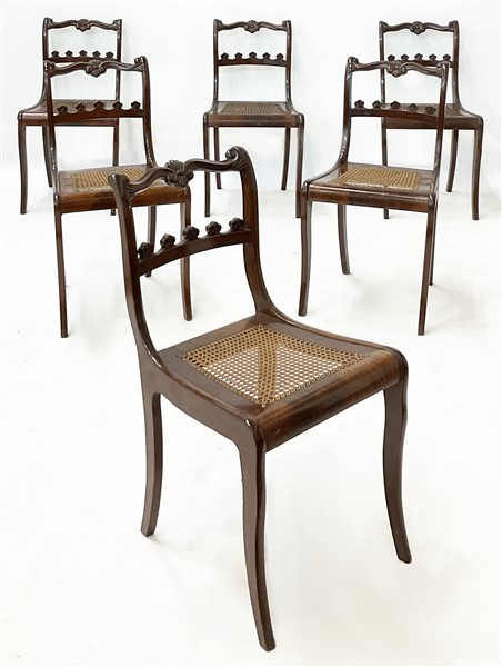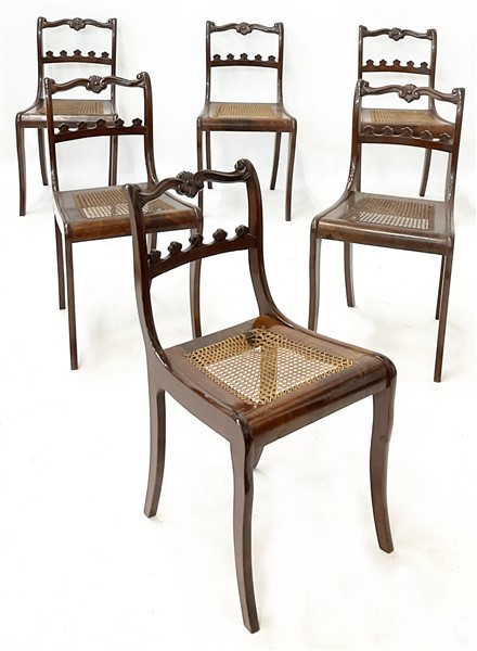 Gruppo di dodici sedie in mogano intagliato con schienali a giorno e sedute in paglia di Vienna (difetti)