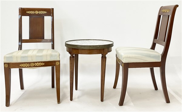 Lotto composto da una coppia di sedie con schienale traforato e fregi in metallo dorato ed un tavolino tondo in legno con piano in metallo decorato a finto marmo, ringhiera traforata e gambe scanalate (d cm 46, h cm 52) (difetti)