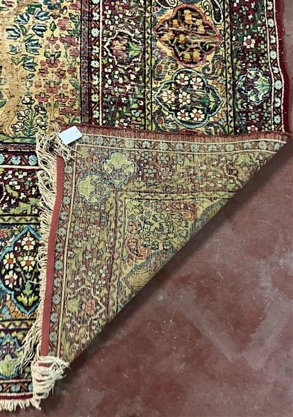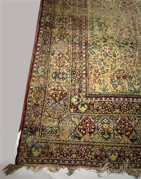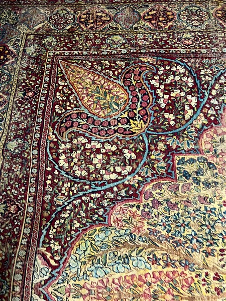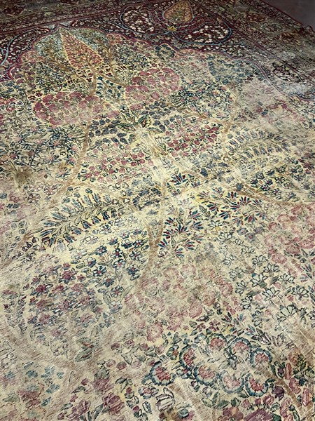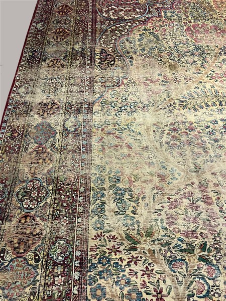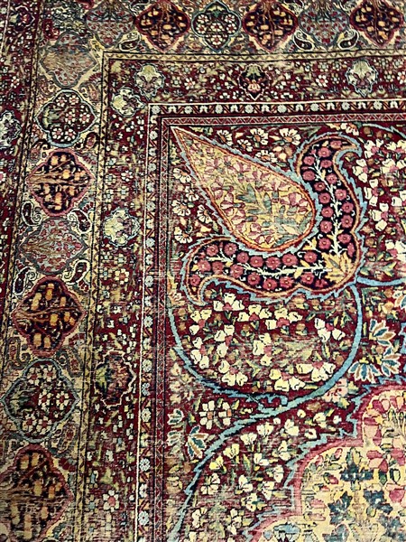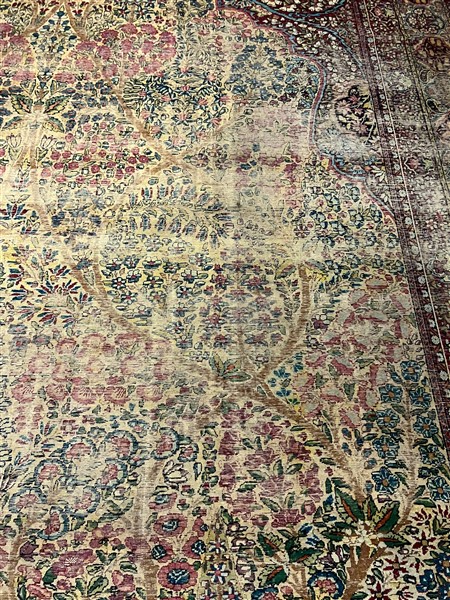 Tappeto preghiera Kirman, Persia, fine secolo XIX. Mirab a fondo beige decorato con motivi millefleur che sorgono da un fiore alla base. Alla punta del Mirab un cipresso con alla base i motivi tipici dell'Impero persiano, decorati con rose della dinasia Qadjar. Agli angoli due cipressi sorretti da una corolla di un fiore stilizzato. Ricca bordura principale con riserve decorate con diverse tipologie di fiori (cm 503x414) (difetti e rapature)