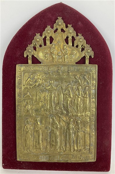 Arte russa, secolo XIX. Icona da viaggio in metallo con cimasa traforata raffigurante Pokrov (o Protezione della Madre di Dio) (cm 20,5x11,5) montata su pannello in velluto (difetti)