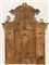 Specchiera in legno intagliato, laccato e dorato a mecca, a struttura architettonica con cimasa a volute contrapposte e fregi con foglie, lesene con fondo specchiato. Secolo XIX. (cm 216x144) (difetti, mancanze e restauri)