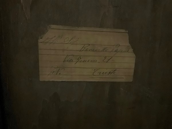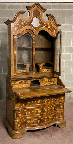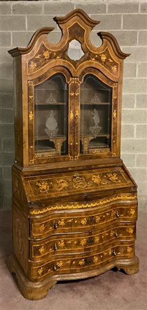 Trumeau in legno lastronato, filettato e intarsiato. Parte inferiore con fronte mosso a tre cassetti decorati a fiori e farfalle, calatoia centrata da stemma tra mazzi fioriti celante quattro tiretti, vano e segreto. Parte superiore a due ante a vetri incisi. Cimasa a linea spezzata centrata da specchio ( cm 110x232x54) (difetti e restauri)
