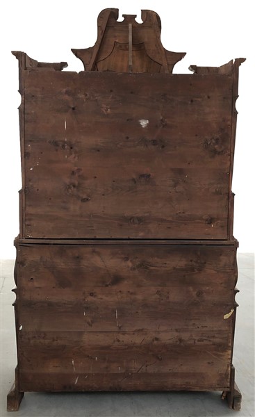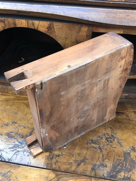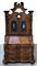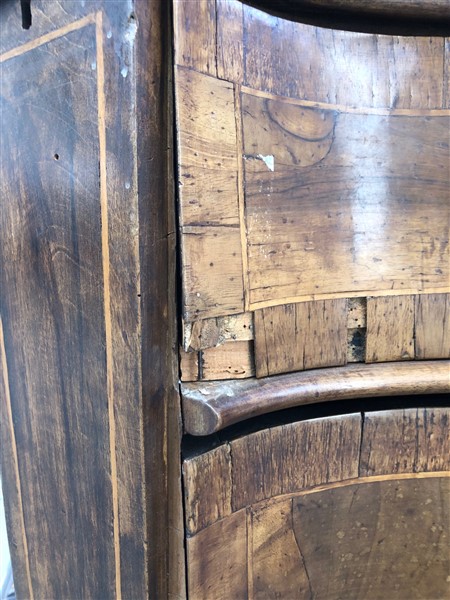 Trumeau veronese lastronato, radicato e filettato a due corpi, calatoia con all'interno vani e cassettini. Parte superiore a due ante con specchi incisi da scena galante, cimasa di forma architettonica. Parte inferiore mossa a tre cassetti, piedi a mensola (cm 150x255x76) (difetti, mancanze e restauri)