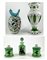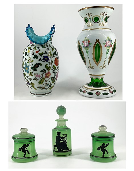 Lotto composto da due diversi vasi in vetro dipinto in policromia a motivi floreali e un set da toilette in vetro verde con figure nere (h. max cm 32) (difetti)