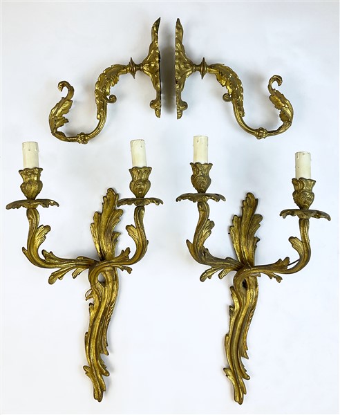 Lotto composto da coppia di applique a due fiamme in metallo dorato con bracci a volute e coppia di reggitenda di simile decoro (h. max cm 46) (difetti)