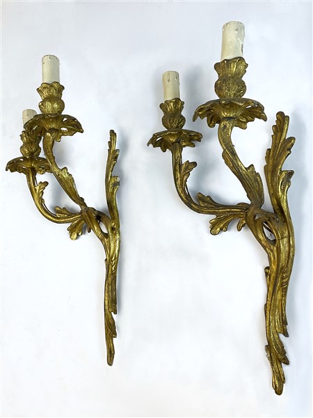 Lotto composto da coppia di applique a due fiamme in metallo dorato con bracci