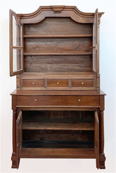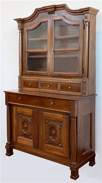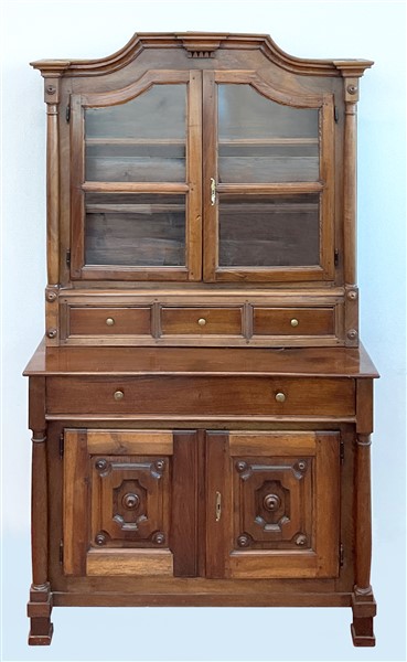 Credenza a due corpi con parte inferiore a due ante e un cassetto sottopiano, parte superiore con due ante sagomate a vetri e tre cassetti, montanti a colonna. Piemonte, secolo XIX (cm 130x225x60) (difetti e restauri)