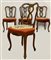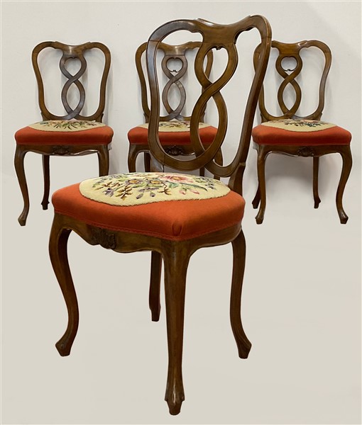 Lotto composto da due sedie in noce di forma mossa, schienale a giorno centrato da elemento traforato. Veneto, secolo XVIII. Unite ad altre due di simil decoro in stile settecentesco (lievi difetti)