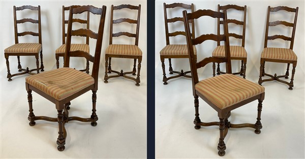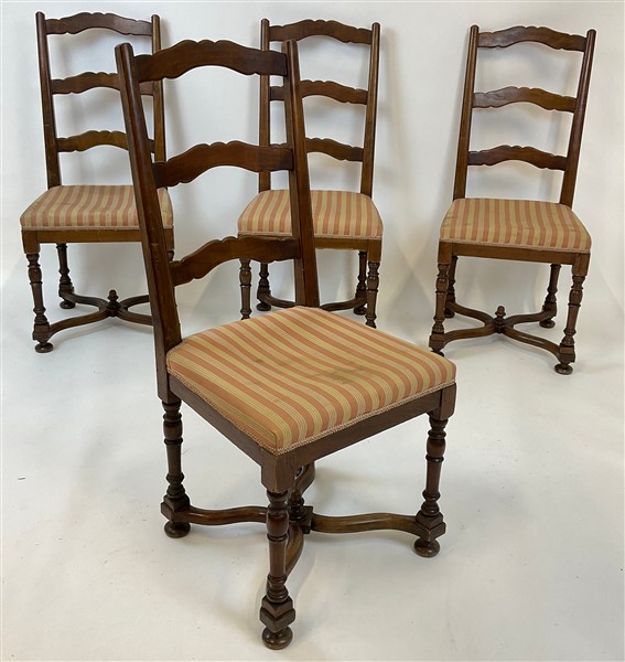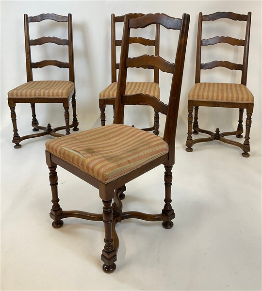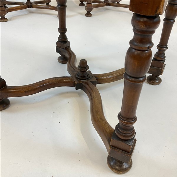 Gruppo di otto sedie in noce con schienale a tripla cartella sagomata e gambe tornite raccordate da traverse. Secolo XIX (difetti e restauri)