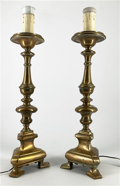 Coppia di candelieri in bronzo con fusto a baulaustro su base tripode, XVIII secolo (h. cm 40) adattati a lampada in epoca successiva (difetti restauri)