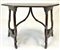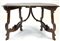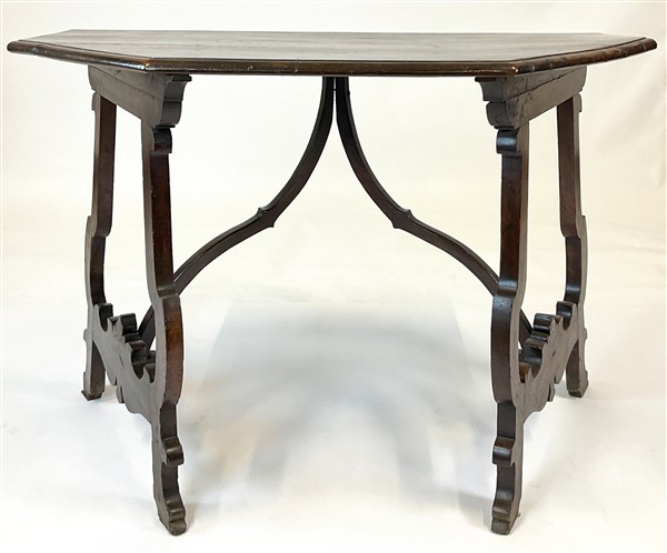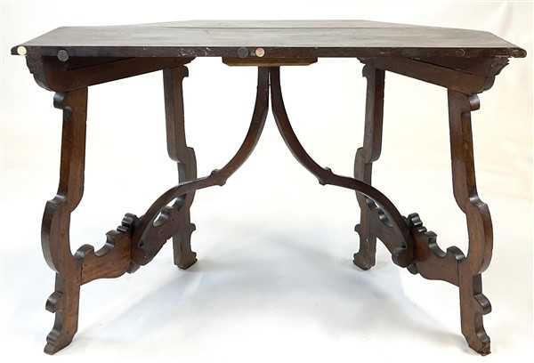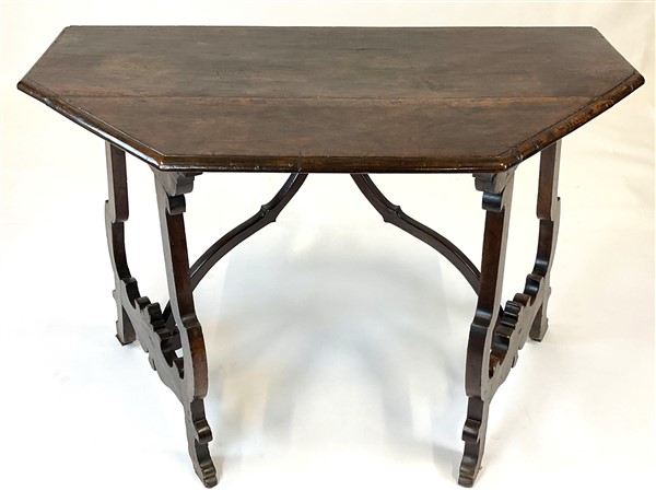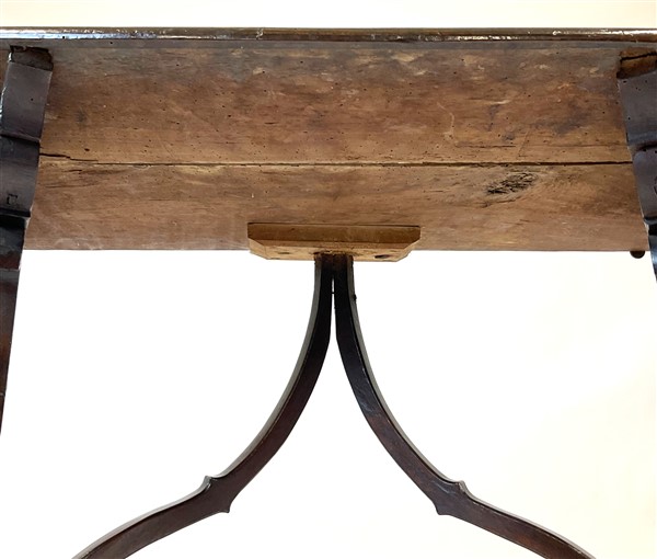 Antico tavolo fratino da parete in noce, gambe a lira riunite da traverse sagom