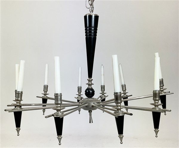 Lampadario in metallo cromato e legno ebanizzato a dieci bracci a forma di raggera. Seconda metà secolo XX. (d cm 83) (difetti)