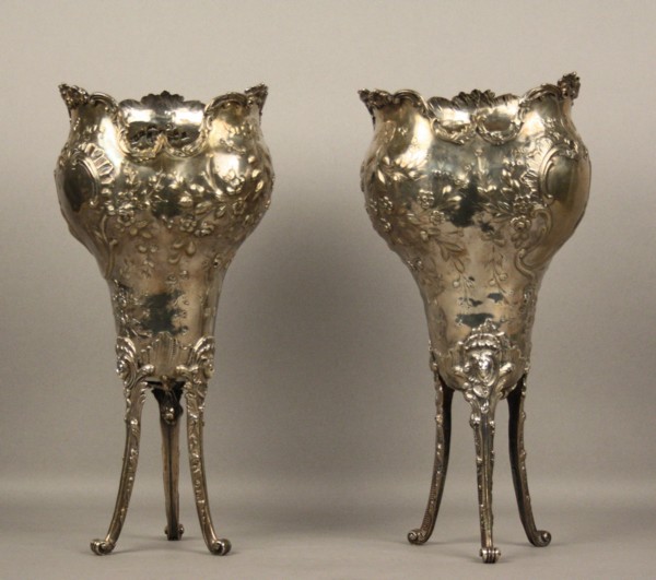 Coppia di vasi in argento sbalzato a motivi floreali, sorretti da tre piedi decorati da maschere, gr. 950. Parigi. XIX secolo. Mis. Alt. cm. 27 Diam. cm. 13 ca.
