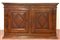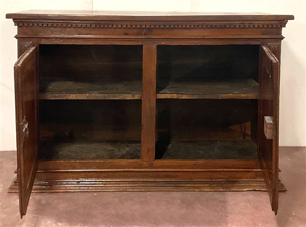 Antica credenza in noce a due ante pannellate e riquadrate, dentellatura sottop