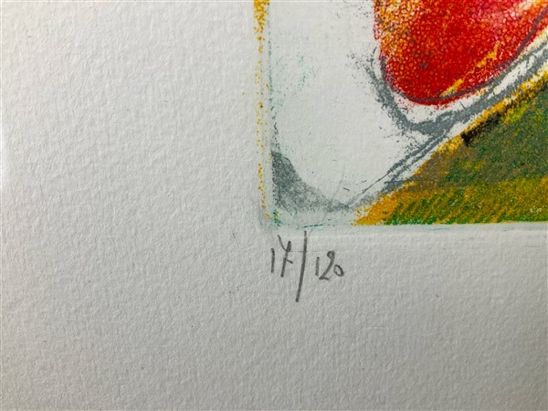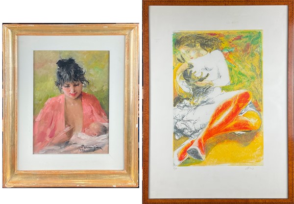 Lotto composto da un olio su tela di Aldo Parmigiani raffigurante giovane madre (cm 35x25), firmato, titolato e datato 1988 e una litografia di Ennio Calabria raffigurante donna con coniglio (cm 69x49) firmata e numerata 17/120 in basso a matita