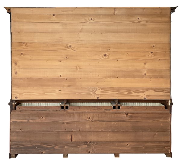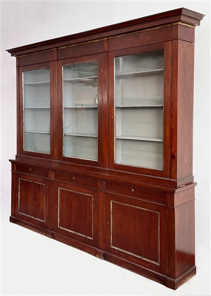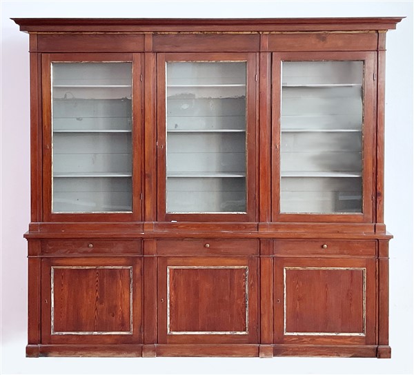 Libreria a due corpi in legno tinto, parte superiore a tre ante con vetri, parte inferiore a tre cassetti e tre sportelli (cm 280x256x40) (difetti e rotture)