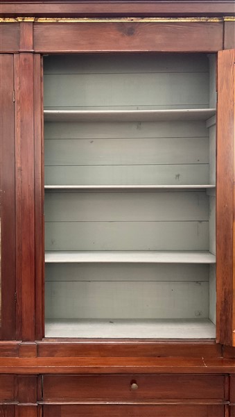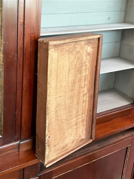 Libreria a due corpi in legno tinto, parte superiore a tre ante con vetri, part