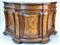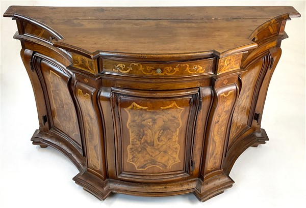 Antica credenza in legni vari, di forma mossa a tre ante e un cassetto sottopiano, decorata da intarsi e riserve in radica. (cm 160x101x60) (difetti)