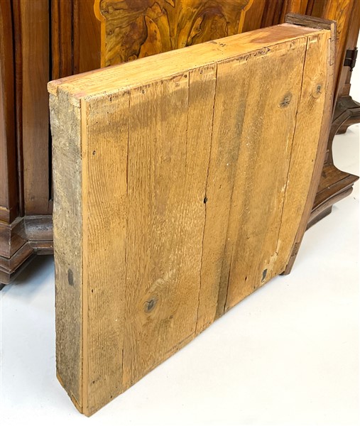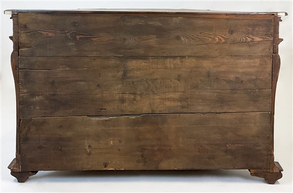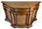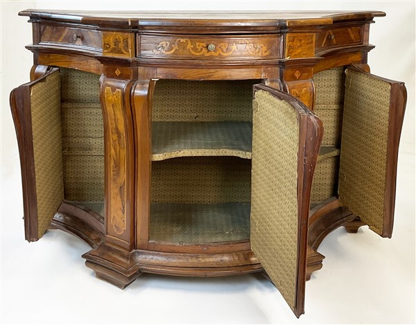 Antica credenza in legni vari, di forma mossa a tre ante e un cassetto sottopia