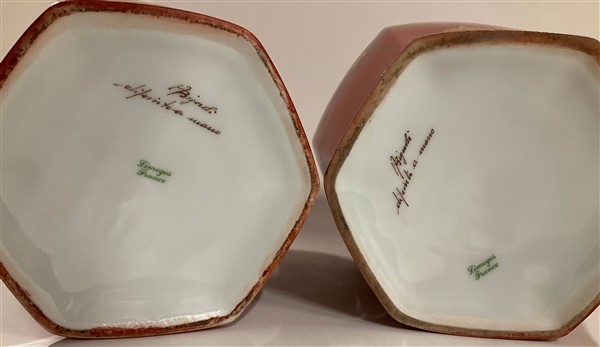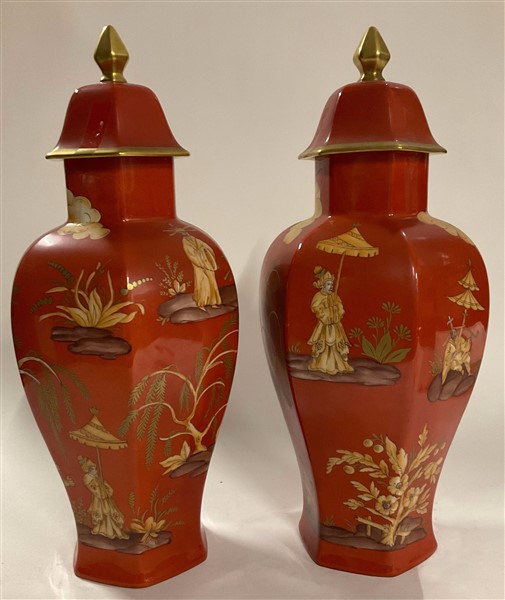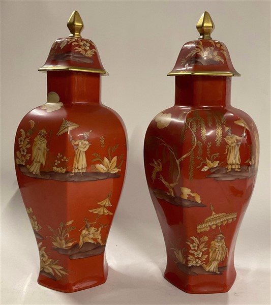 Manifattura di Limoges. Coppia di potiche con coperchio in porcellana di forma esagonale, dipinta in policromia a cineseria e oro su fondo rosso. Marca e firma del decoratore sul fondo. (h cm 52) (lievi difetti)
