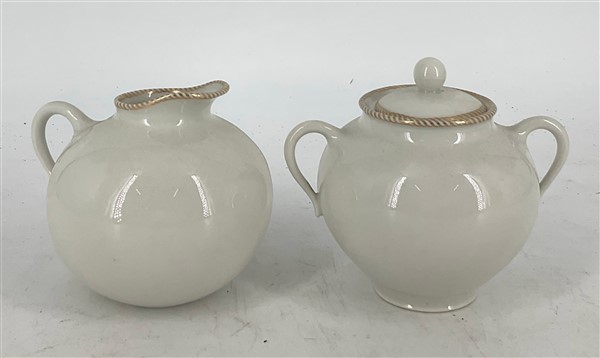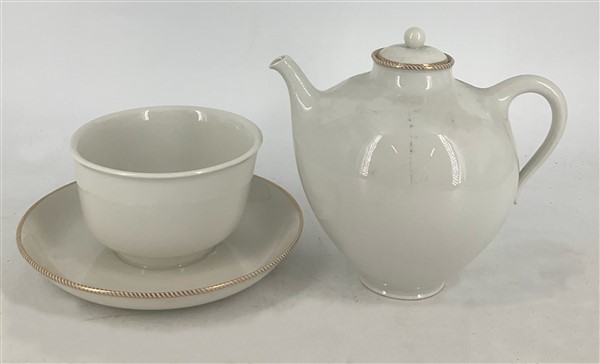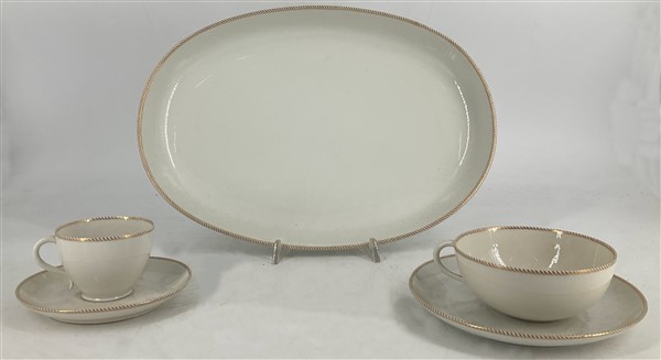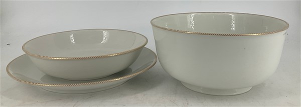 Manifattura Richard Ginori. Parte di servizio da tavola in porcellana bianca con profili in oro composto da: ventitré piatti piani, undici piatti fondi, dodici piatti da frutta, dodici piattini da dessert, undici piattini per pane, due legumiere con coperchio, quattro diverse ciotole, cinque diversi piatti da portata ovali e due tondi, due salsiere, teiera, zuccheriera, due lattiere, undici tazze da tè con piattini, undici tazzine da caffè con piattini (difetti)