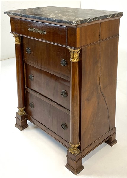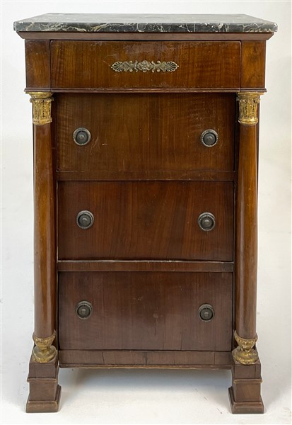 Comodino Impero impiallacciato in mogano con fronte a tre cassetti e piccola anta, montanti a colonna con capitelli dorati. Secolo XIX. Piano in marmo d'epoca successiva. (cm 59x95x40,5) (difetti)