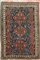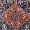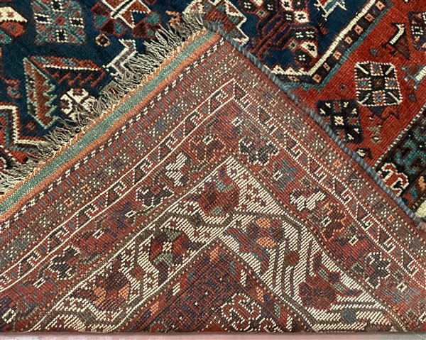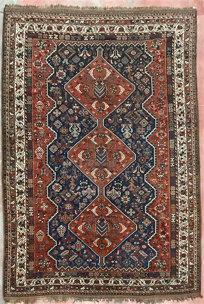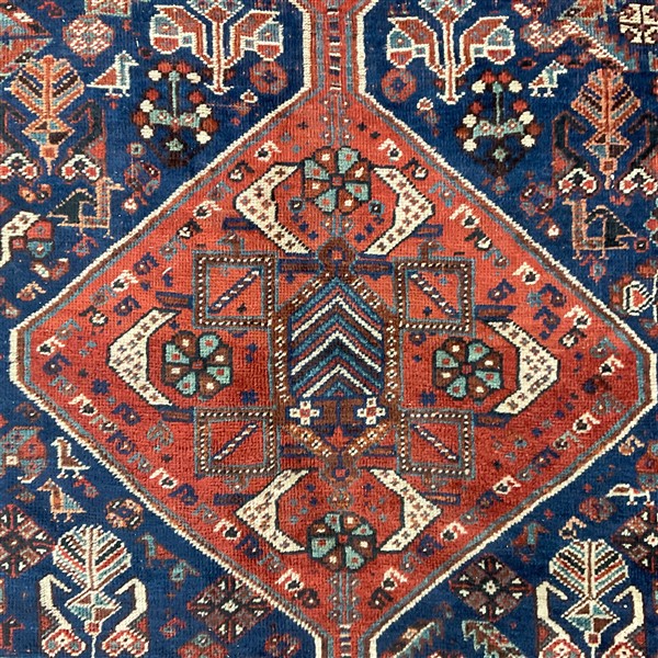 Tappeto Qashqai, Persia, secolo XX. Decoro con tre medaglioni romboidali rossi su campo blu notte, cosparsi di simboli vegetali ed animali stilizzati, molteplici bordure (cm 326x230) (difetti)
