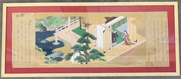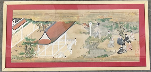 Lotto di quattro scroll Emaki su carta raffiguranti scene di palazzo e secene animate, in cornici