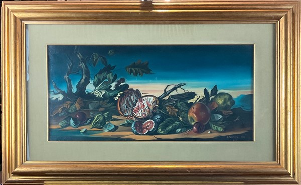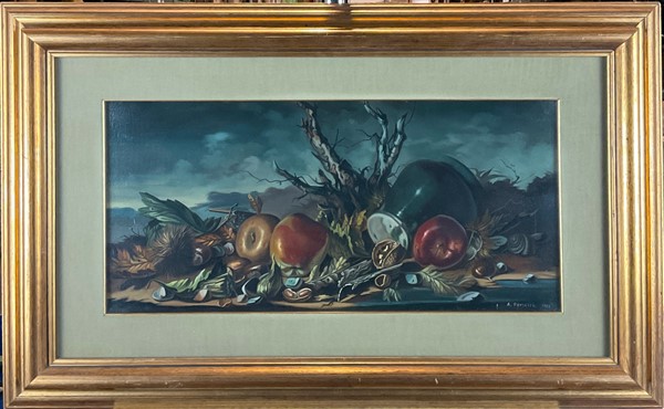 Due oli su tela raffiguranti nature morte (cm 29,5x60) firmati e datati 1966 in basso a destra