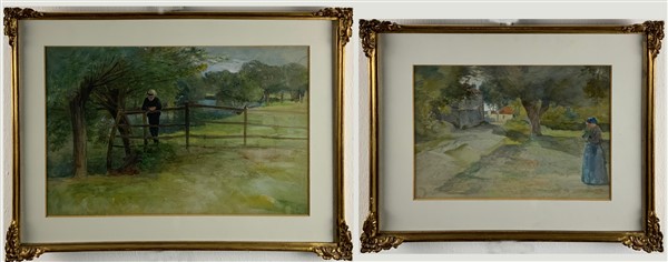 Coppia di acquerelli su carta raffiguranti "Figure in paesaggi boschivi", di diverse misure
