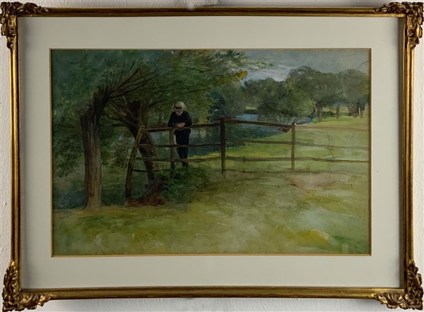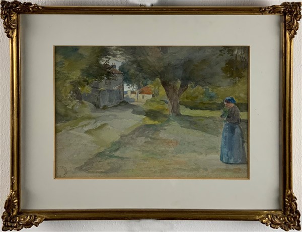 Luigi Chialiva Coppia di acquerelli su carta raffiguranti "Figure in paesaggi bo
