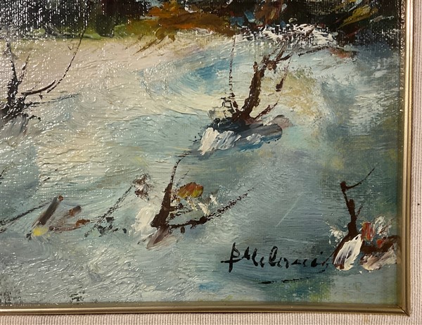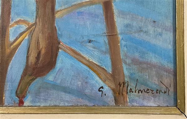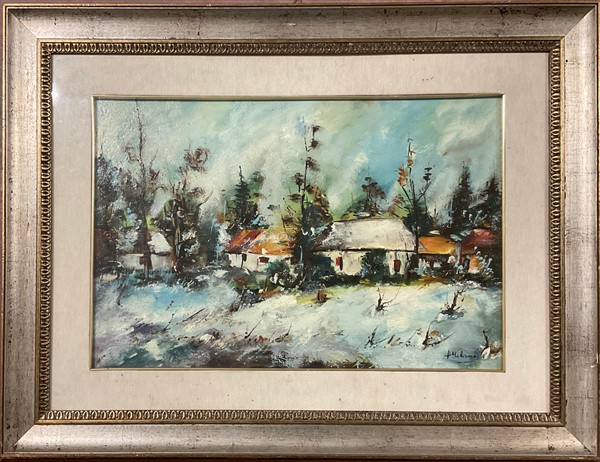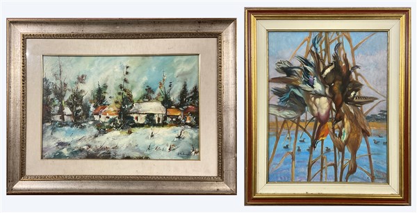 Lotto composto da un olio su tela su compensato raffigurante cacciagione di Giannetto Malmerendi (cm 60x48) firmato in basso a destra e un olio su tela raffigurante paesaggio innevato con case di firma indecifrata (cm 40x60) firmato in basso a destra