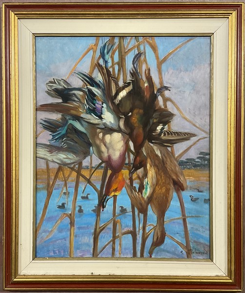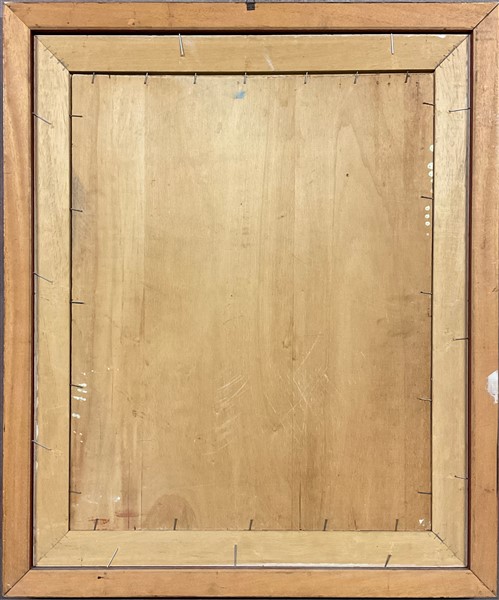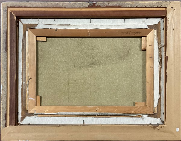 Lotto composto da un olio su tela su compensato raffigurante cacciagione di Gia