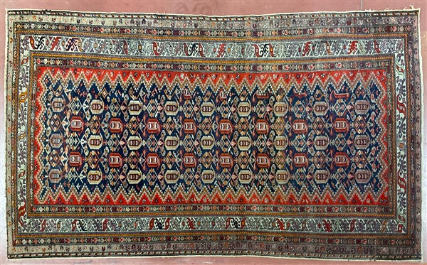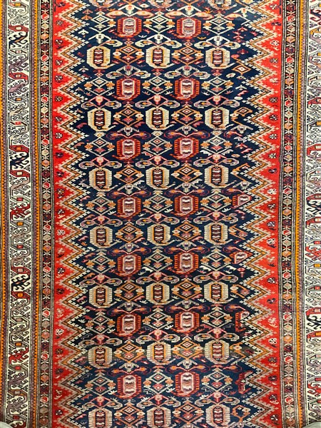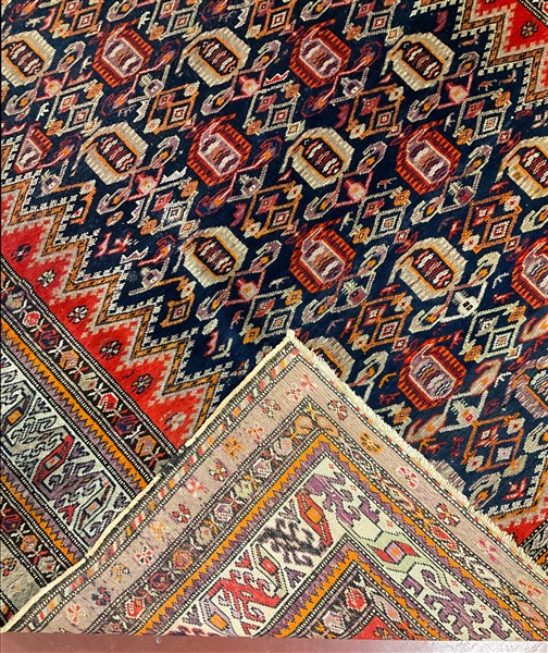 Tappeto Malayer, Persia, inizio secolo XX. Decoro all over con file di Boteh policromi su fondo blu notte, bordura principale a meandro su fondo blu notte (cm 270x162) (difetti)