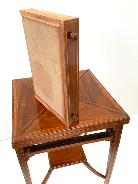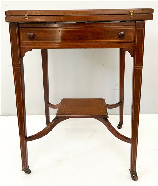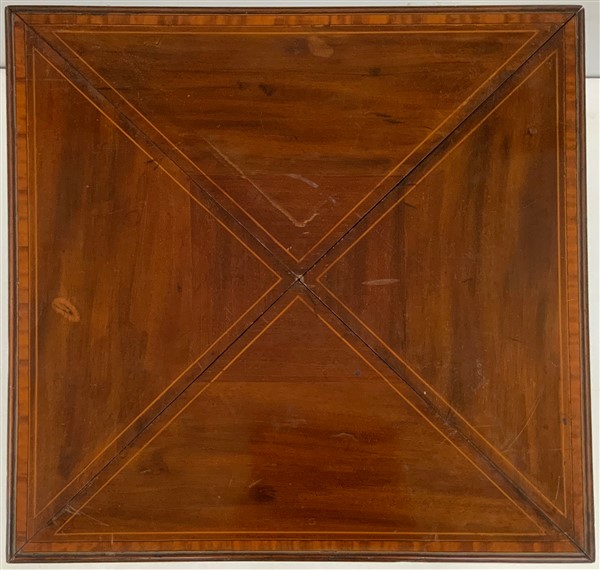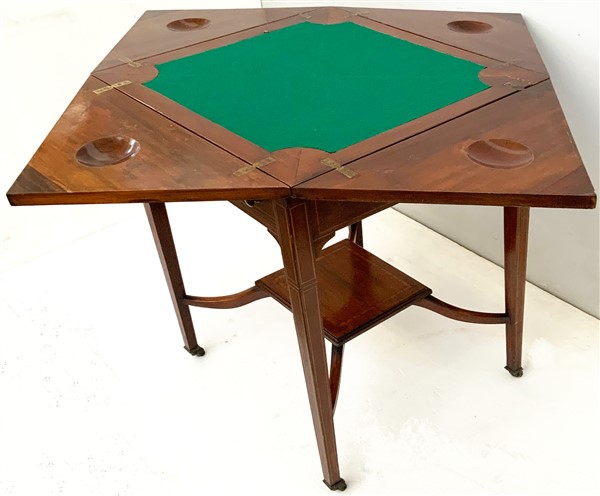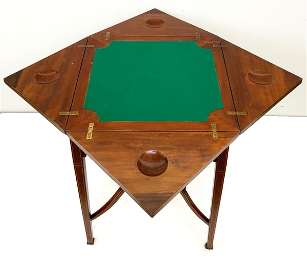 Tavolino da gioco a fazzoletto in mogano filettato in bois de rose con alette apribili e vani portafiches. Piano rivestito in panno verde e cassetto nella fascia. Quattro gambe rastremate riunite da pianetto e crociere sagomate. Inghilterra. (cm.76,5x70x76,5 aperte)