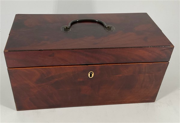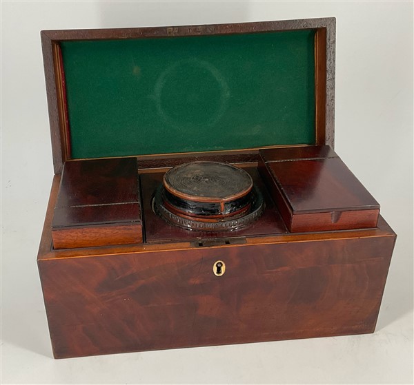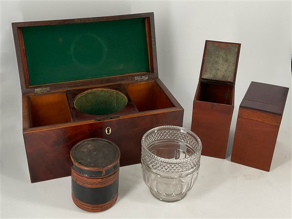Lotto composto da un tea caddy con cofanetto impiallacciato in mogano, interno