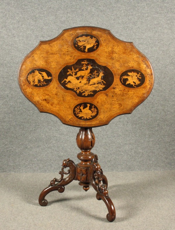Tavolino a biscotto a vela in legno di noce con piano sagomato e intarsi a motivi di montagna, gamba centrale intagliata. Fine XIX secolo. Difetti e mancanze. Mis. Lung. cm. 75 Alt. cm. 74 Prof. cm. 55 ca.