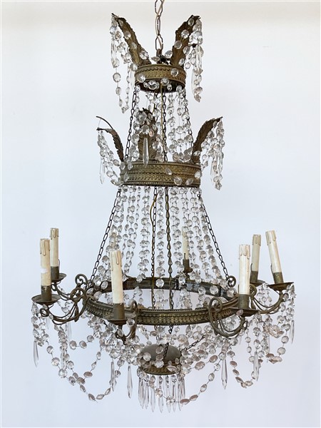 Lotto 943 | Lampadario a cesto in metallo sbalzato e daorato a otto luci decorato con caten