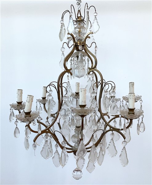 Lampadario in metallo con pendenti in vetro a nove luci decorato con prisma centrale (cm h 80x diam 75) (difetti e mancanze)