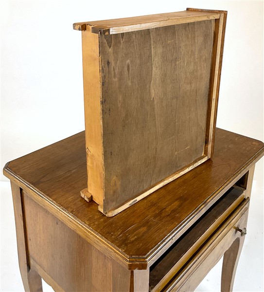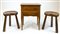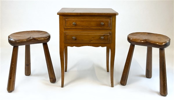 Lotto composto da un mobiletto a due cassetti con alte gambe mosse unito a due sgabelli a tre gambe (cm max 51x67x40) (difetti)