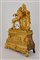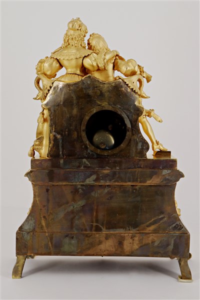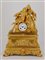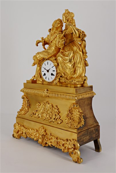 Pendola in bronzo dorato con base a plinto sormontatata da scena galante. Quadrante in smalto bianco con numeri romani.
