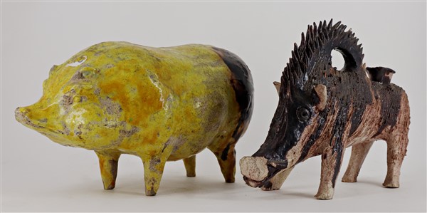 Lotto composto da una brocca a forma di cinghiale ed una scultura raffigurante un maialino in terracotta smaltata, misure diverse (la più grande cm 33x22) (difetti)