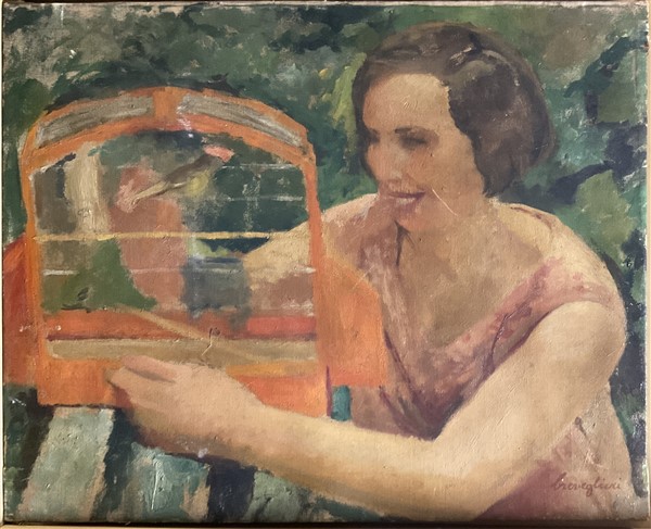 Cesare Breveglieri "Donna con canarino" olio su tela (cm 45x55) firmato in bass