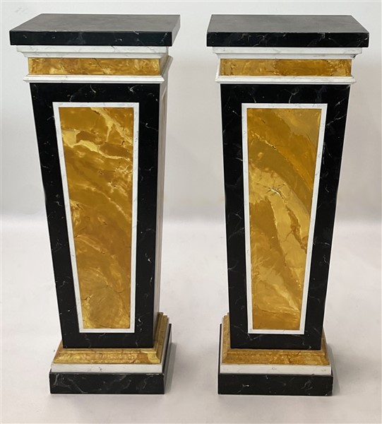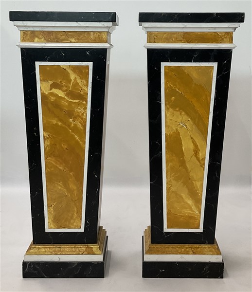 Coppia di alzate in legno dipinto a finto marmo, base e piano rettangolari con