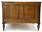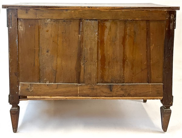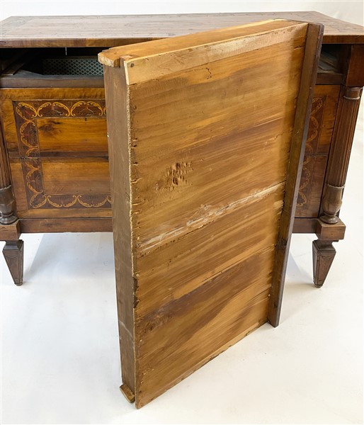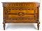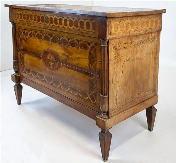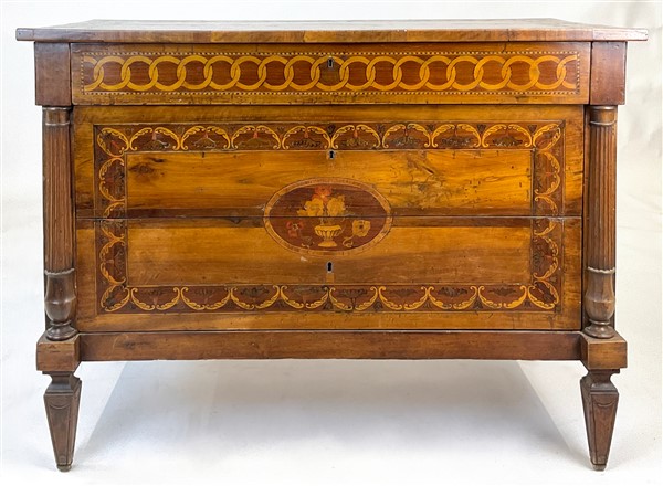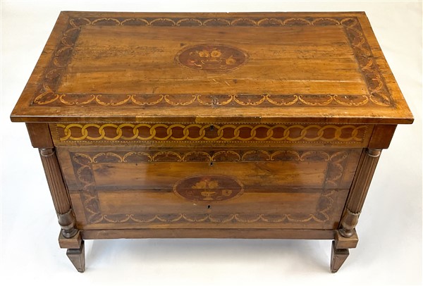 Cassettone in legni vari decorato da intarsi a volute e vasi fioriti entro riserva, montanti a semicolonna scanalata, gambe a obelisco rovesciato. Secolo XIX (cm 119x95x59) (difetti e restauri)