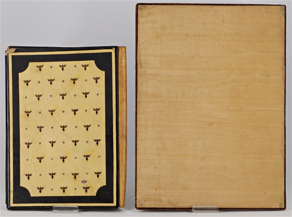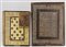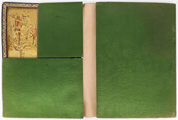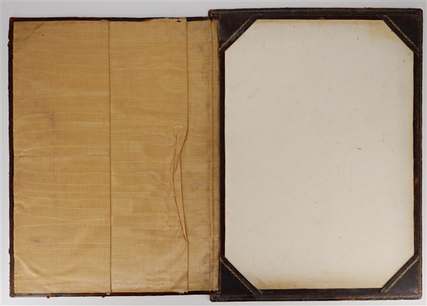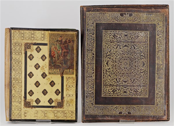 Lotto composto da due antiche cartelle portacorrispondenza di cui una in cuoio impresso e l'altra in pelle e pergamena e riquadro con San Giorgio e il Drago (misura max cm 42x30) (difetti e rotture)